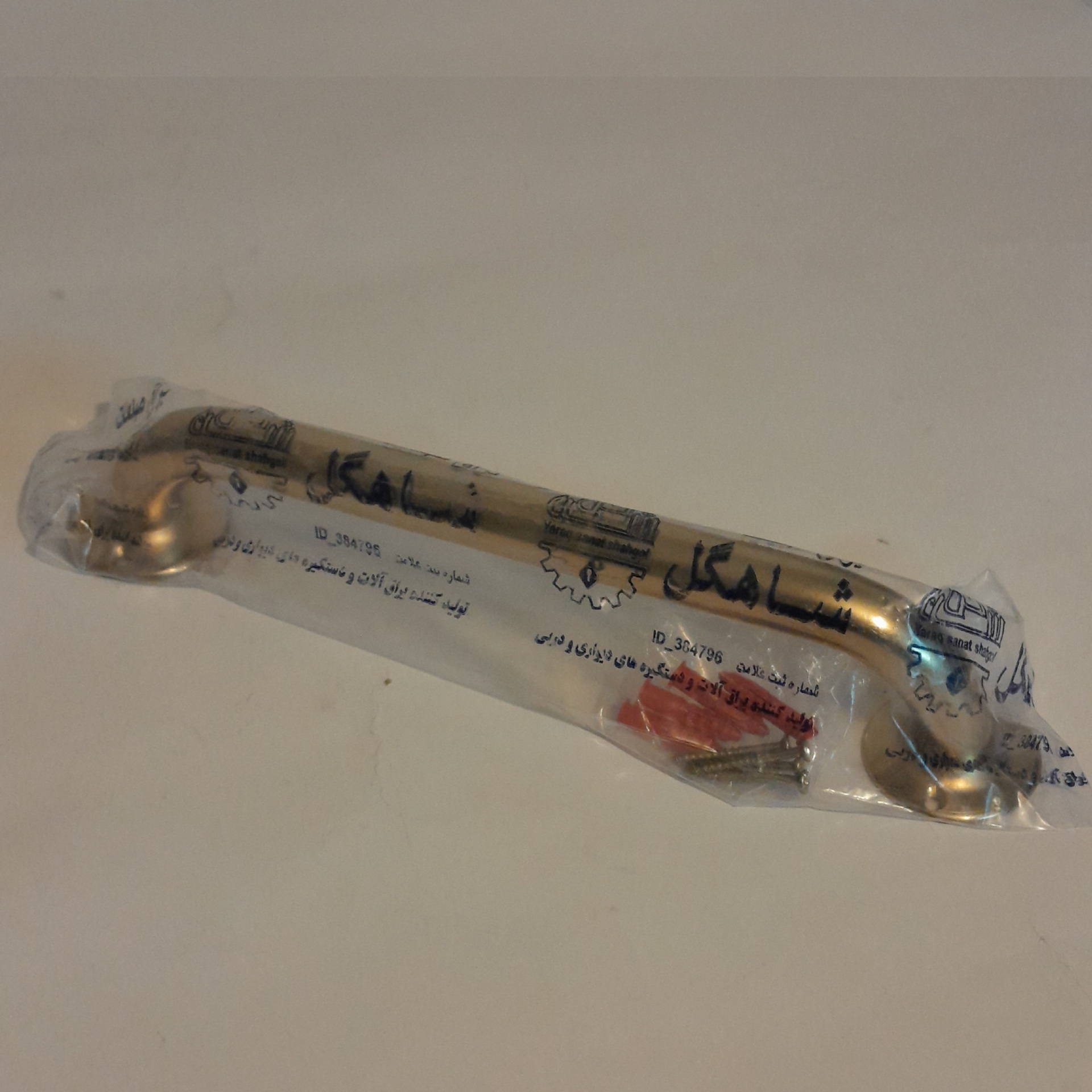 دستگیره آهنی با روکش طلایی همراه با پیچ و رولپلاک لازم در بسته بندی